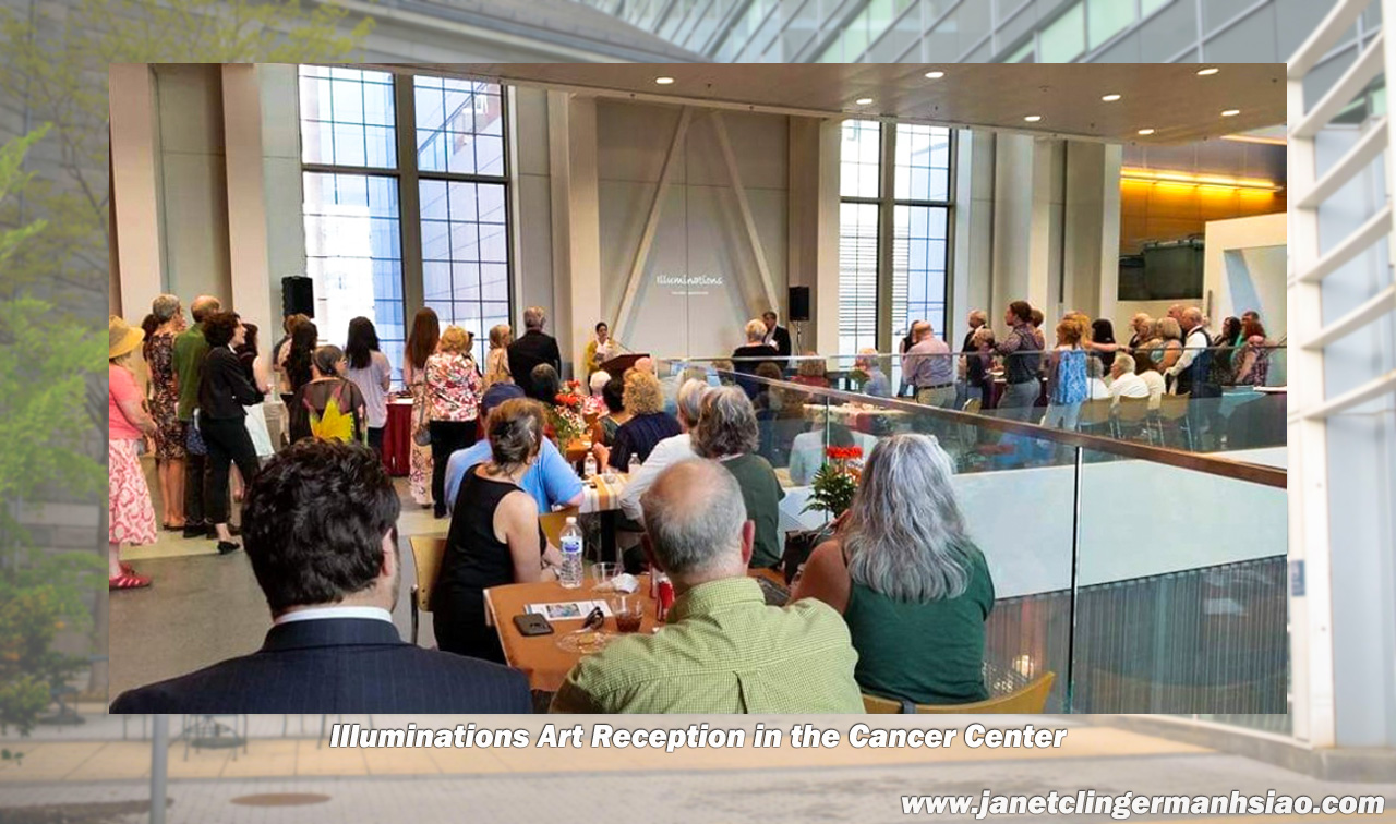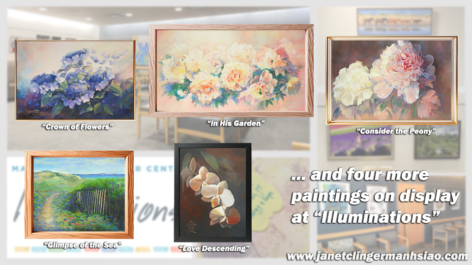 I'm excited to announce that I have nine paintings on display at the "Illuminations" exhibit at the Yawkey Center for Outpatient Care at Mass General Hospital in Boston. The paintings will remain on display from June until mid-September 2018. My hope is that my artwork will give a sense of peace, hope and joy to those going through difficult times. There was a great turnout and a fun time for all at the Illuminations Art Reception last night! Four floors of the Cancer Center have been filled with artwork by some very talented artists, including nine paintings from yours truly. A slideshow of a few pictures from the event are below: