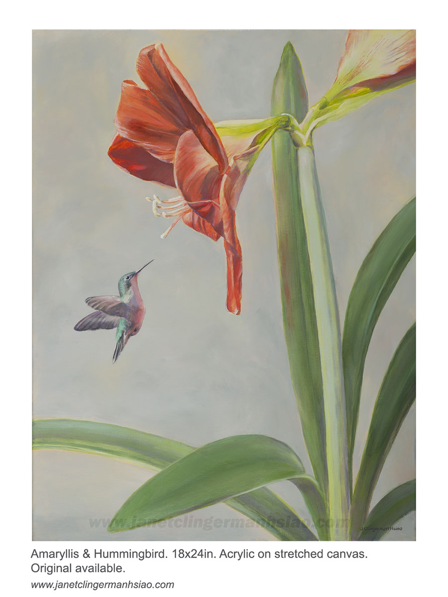 Amaryllis and Hummingbird. 20x25in. Acrylic on gallery wrap canvas. Original available.
