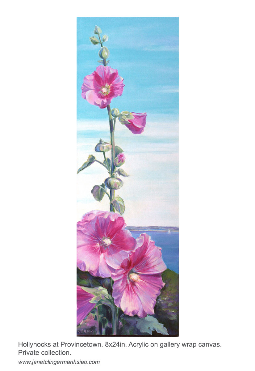 Hollyhocks at Provincetown. 8x24in. Acrylic on gallery wrap canvas. Private collection.