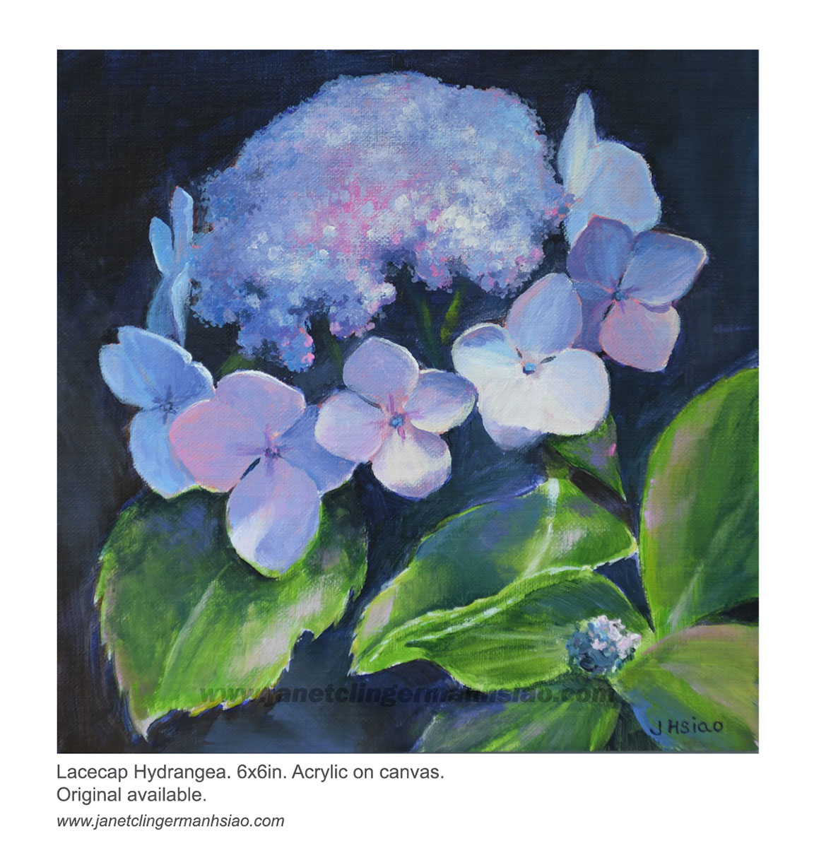 Lacecap Hydrangea. 6x6in. Acrylic on canvas. Original available.