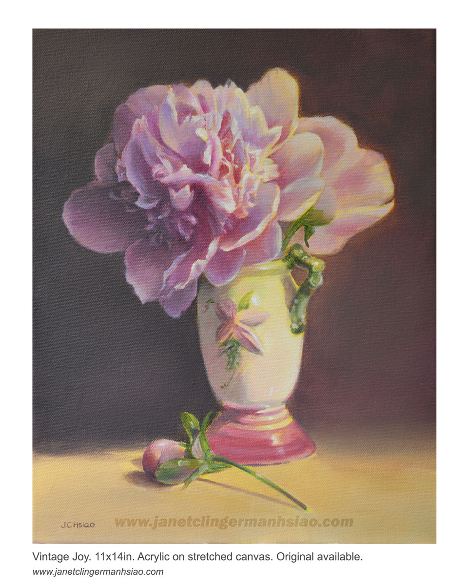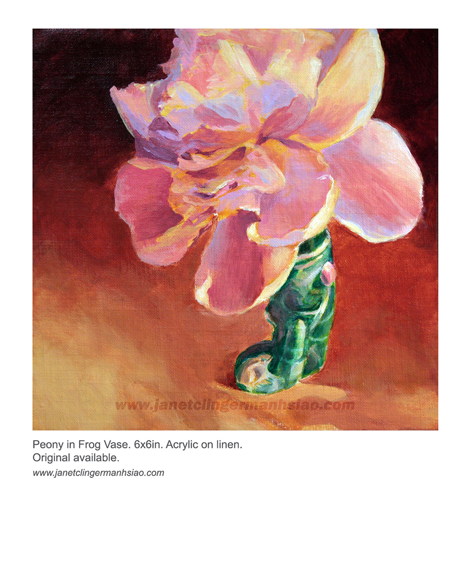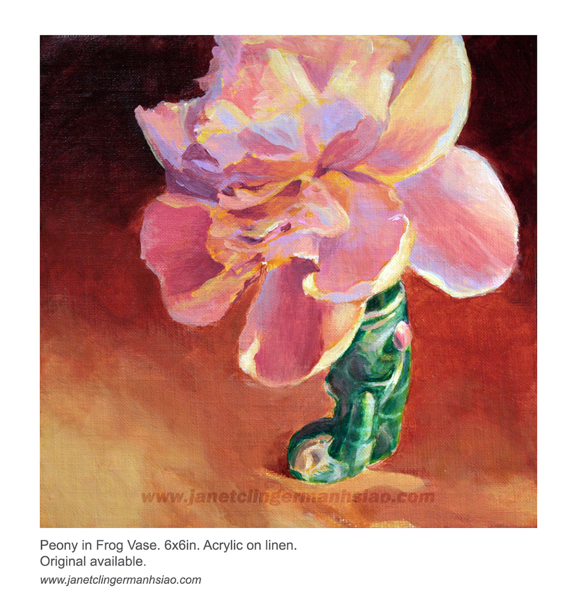 Peony in Frog Vase. 6x6in. Acrylic on linen. Original available.