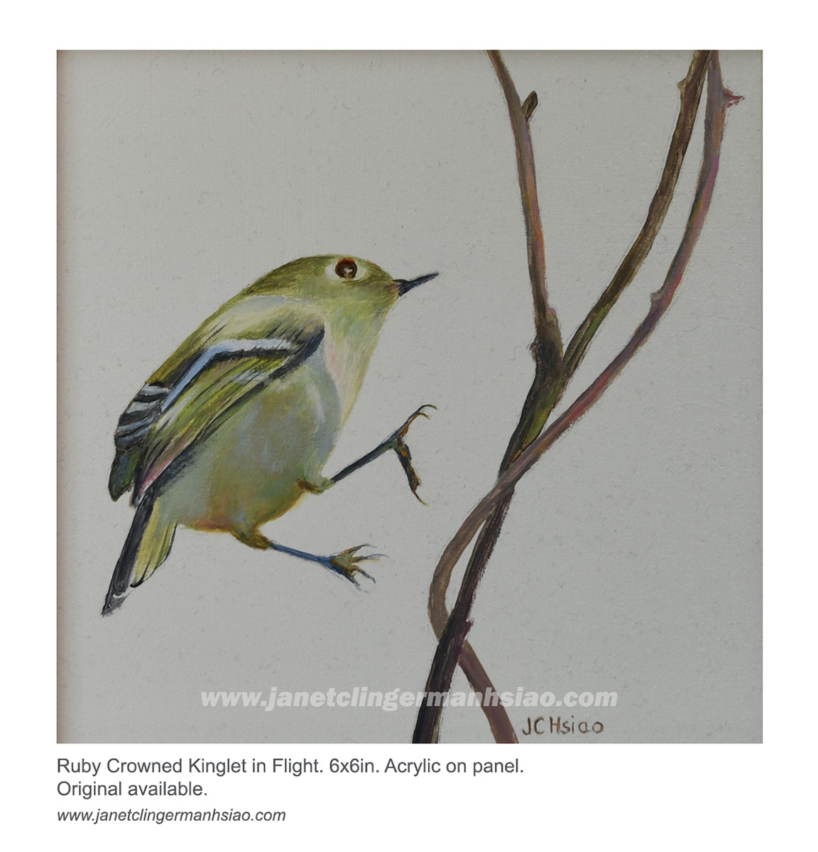Ruby Crowned Kinglet in Flight. 6x6in. Acrylic on panel. Original available.