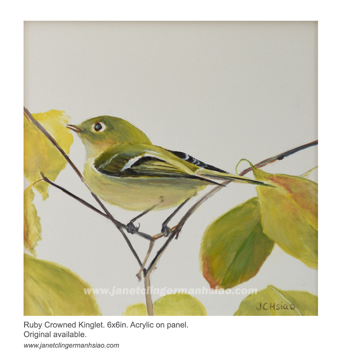 Ruby Crowned Kinglet. 6x6in. Acrylic on panel. Original available.