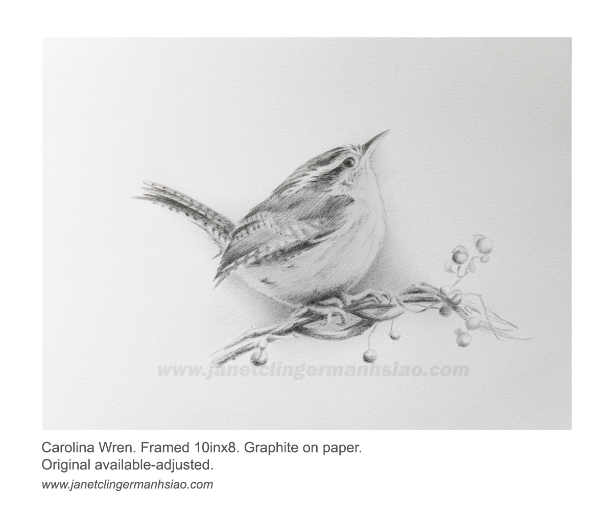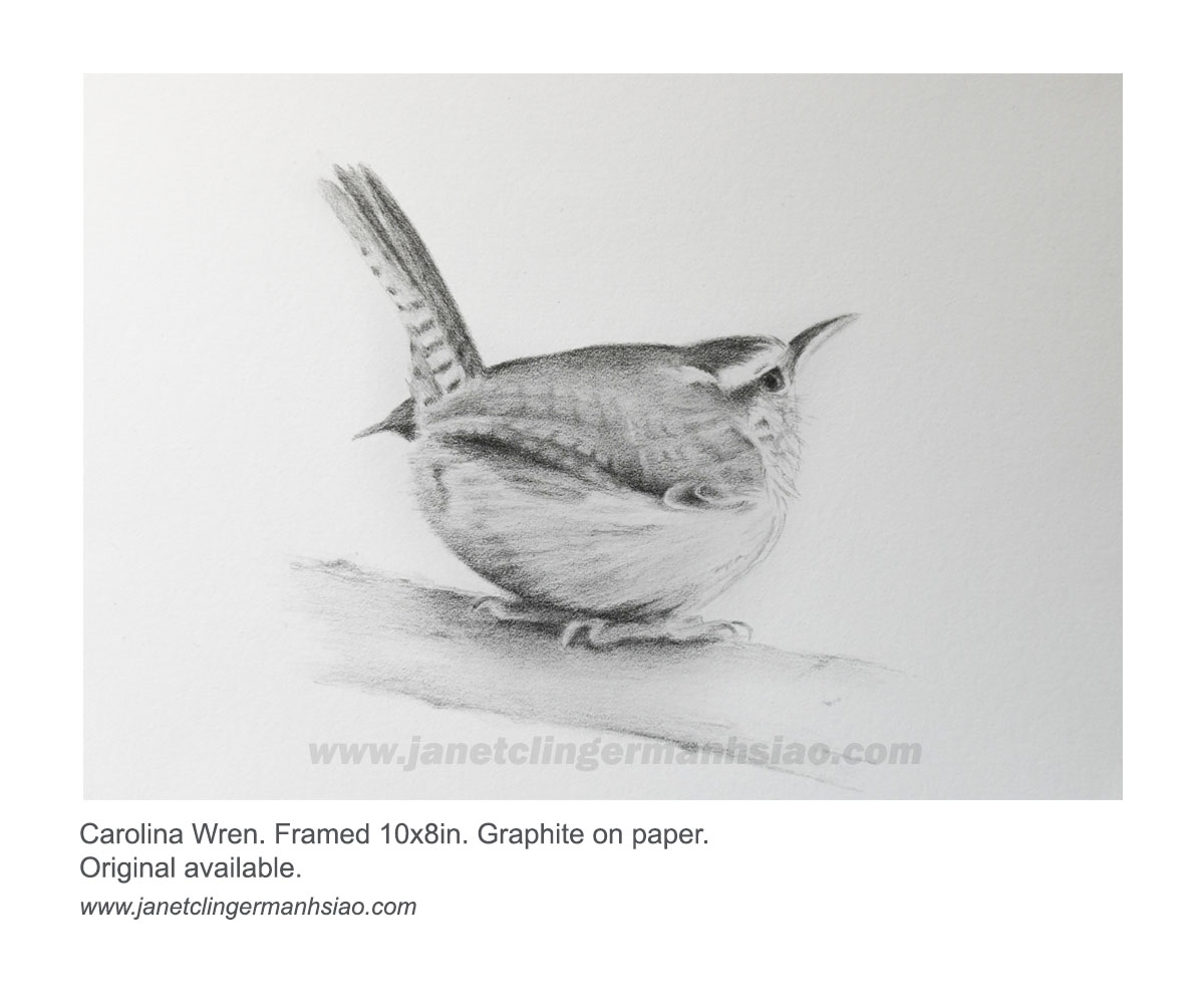 Carolina Wren. Graphite on paper. Framed 10inx8. Original available.
