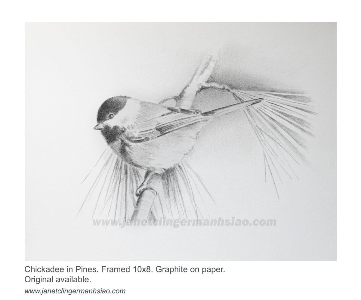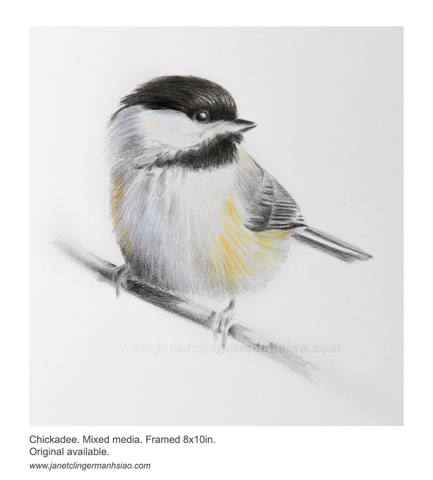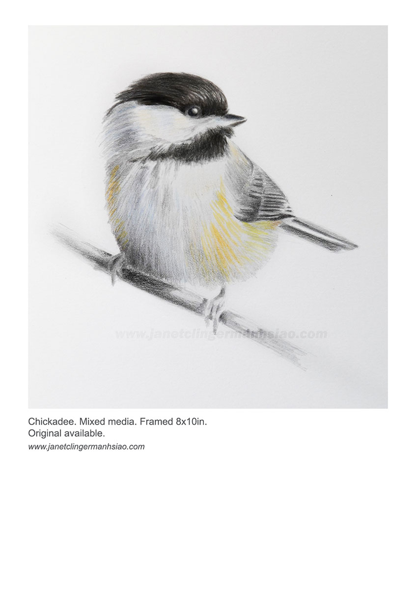 Chickadee. Mixed media. Framed 8x10in. Original available.