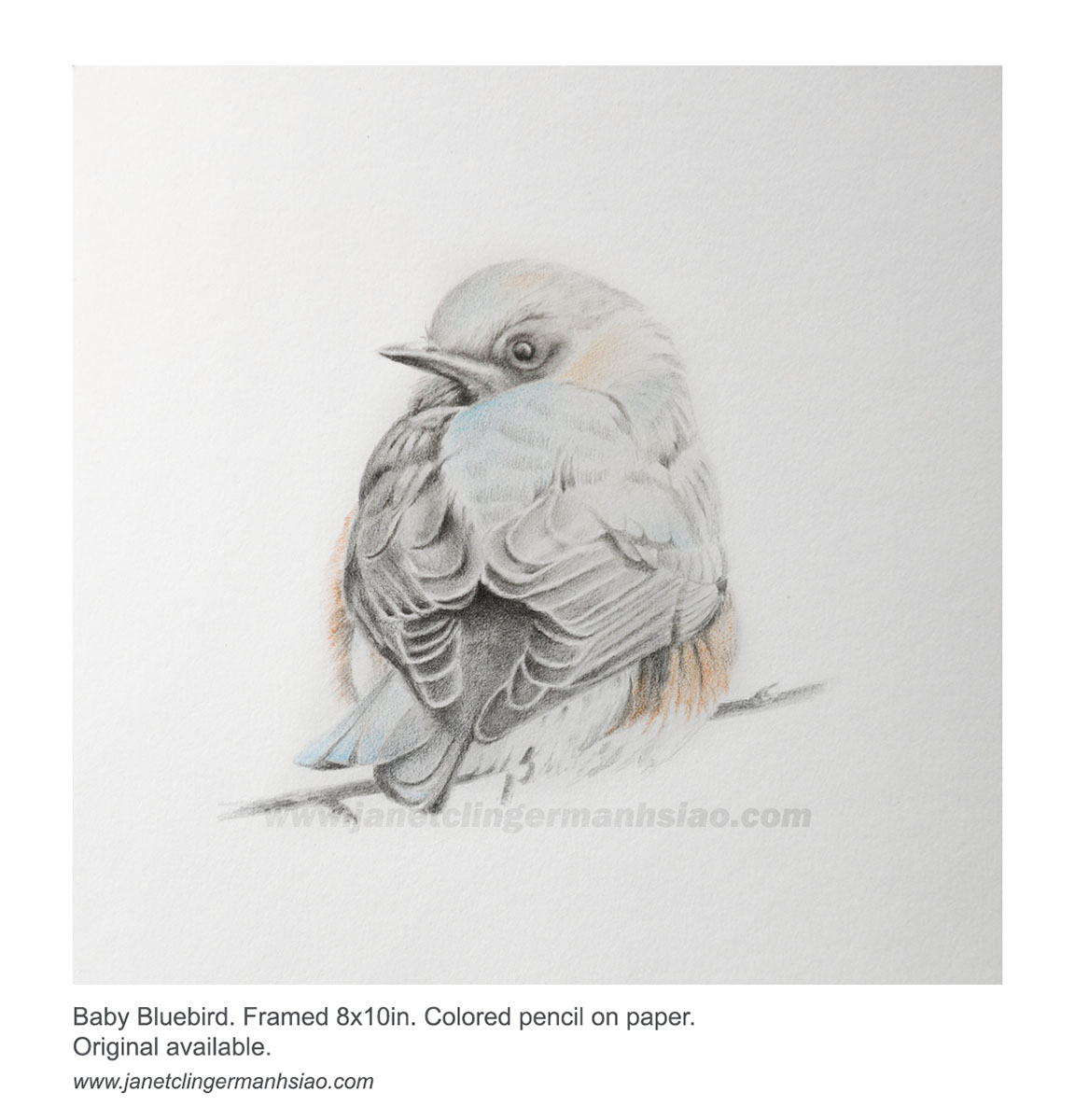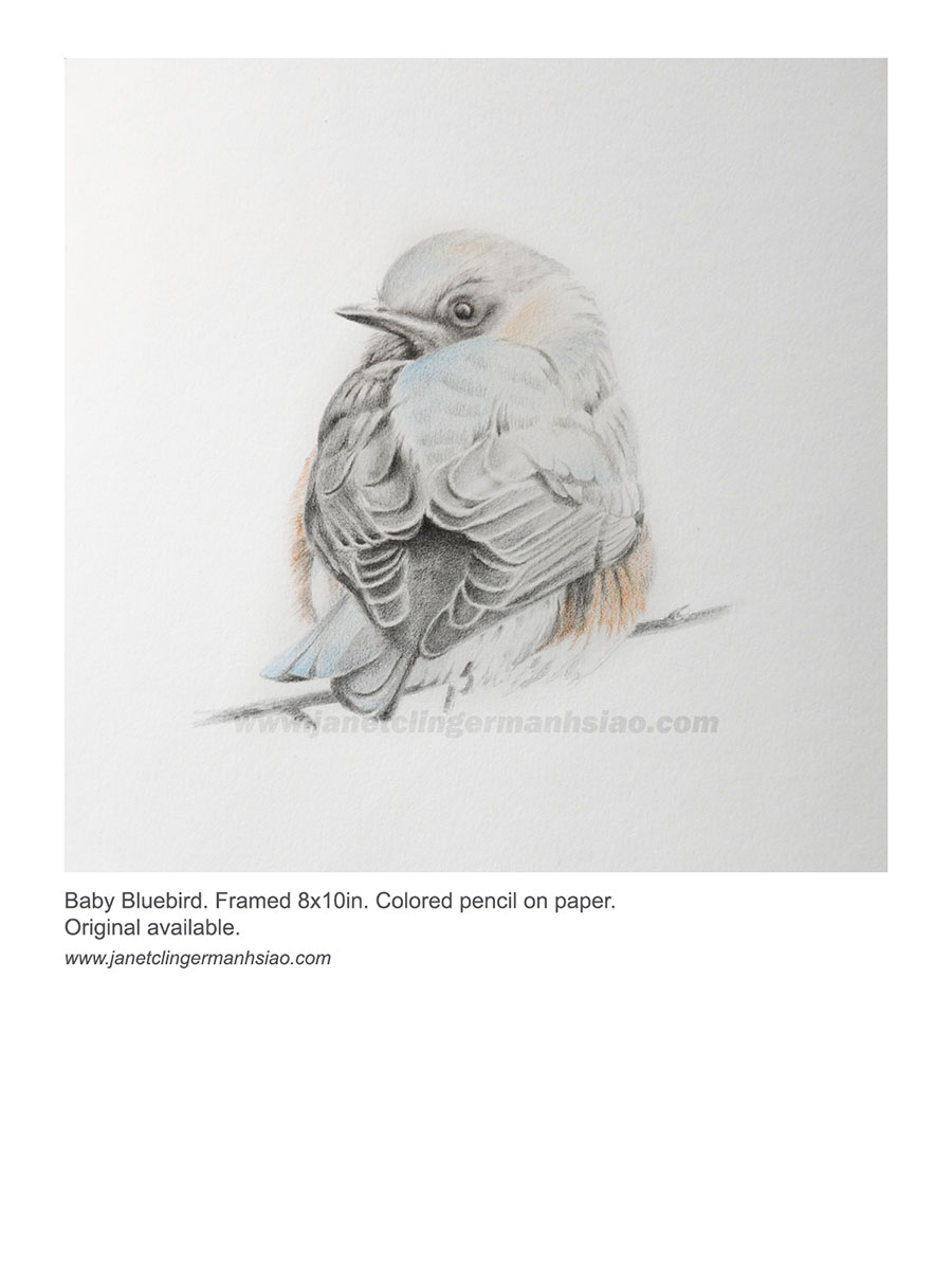 Baby Bluebird. Framed 8x10in. Colored pencil on paper. Original available.