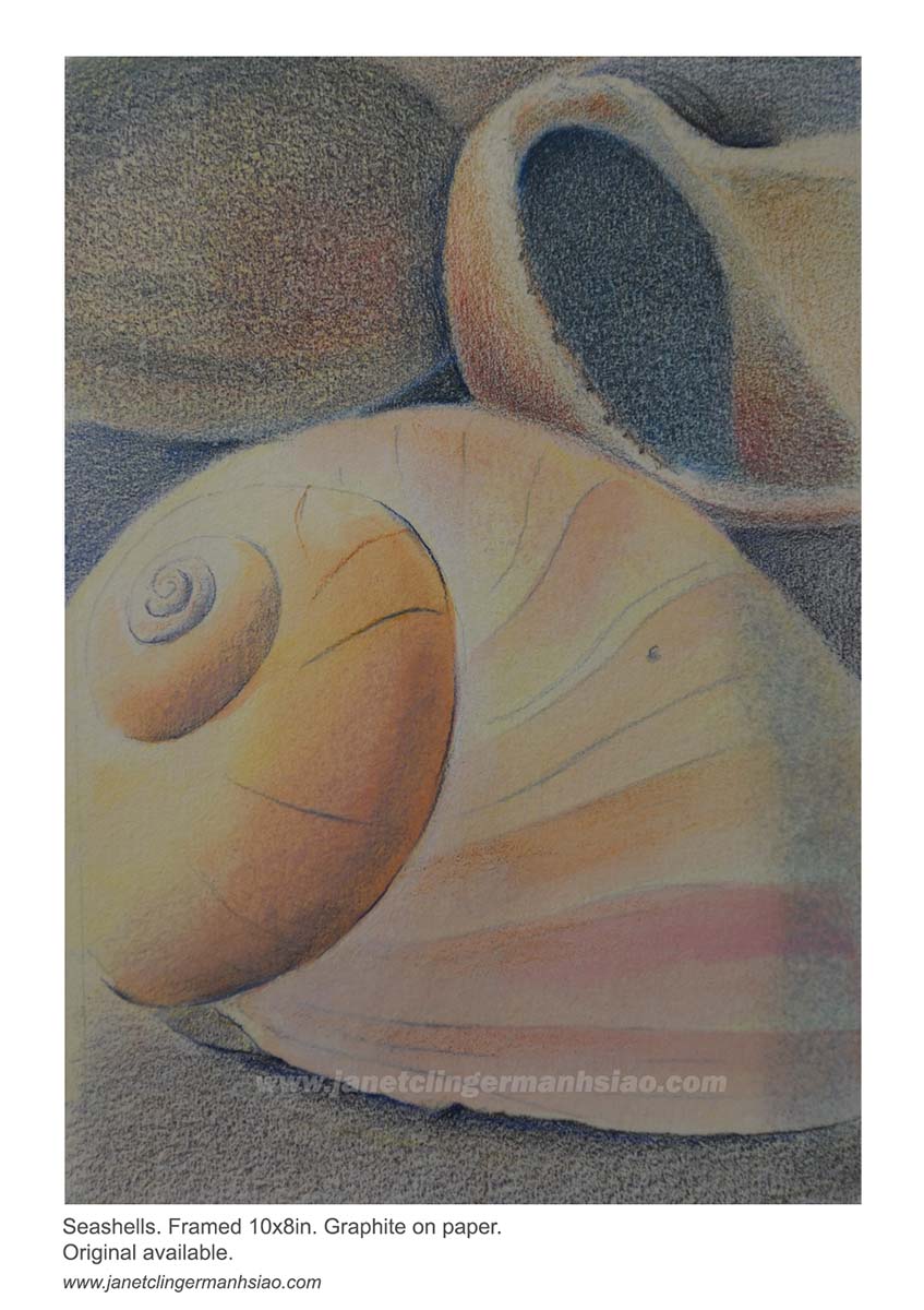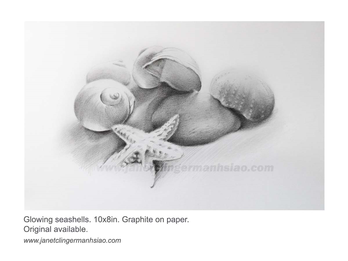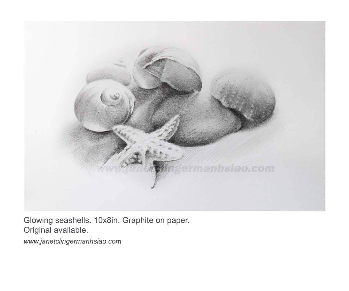 Glowing seashells. 10x8in. Graphite on paper. Original available.