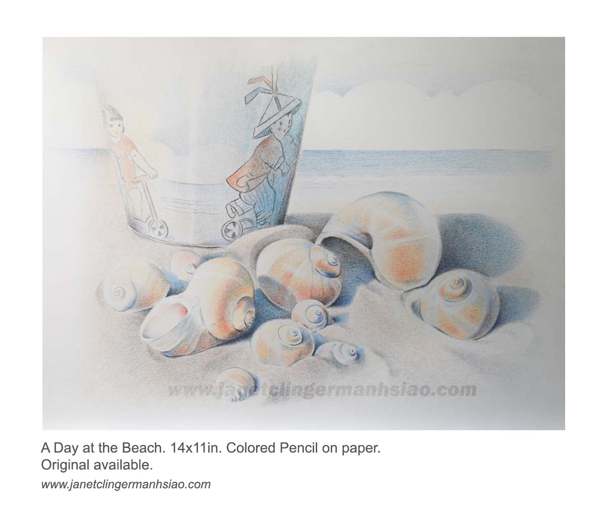 A Day at the Beach. 14x11in. Colored Pencil on paper. Original available.